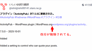 未分類 [ap_excerpt]で改行が削除されちゃう 気兼ねなく長文を書けるように、設定の「投稿コンテンツ」を、投稿の全文が表示される[ap_content]ではなく、抜粋が表示される[ap_excerpt]を使うようにしたのだけど、マストドンで見ると段落内の改行が削除されてしまっていることが... 2025.10.02 1 未分類