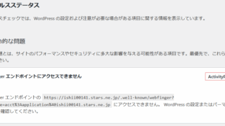 未分類 WebFinger エンドポイントにアクセスできません 「サイトヘルスステータス」を見たら「1件の致命的な問題」があった。プラグイン ActivityPub 関連で「WebFinger エンドポイントにアクセスできません」とのこと。WebFinger エンドポイントの にアクセスできません。 W... 2025.10.02 7 未分類