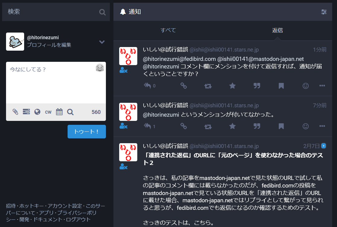 fedibirdに通知が届いたコメントと届かなかったコメント | いしい@試行錯誤