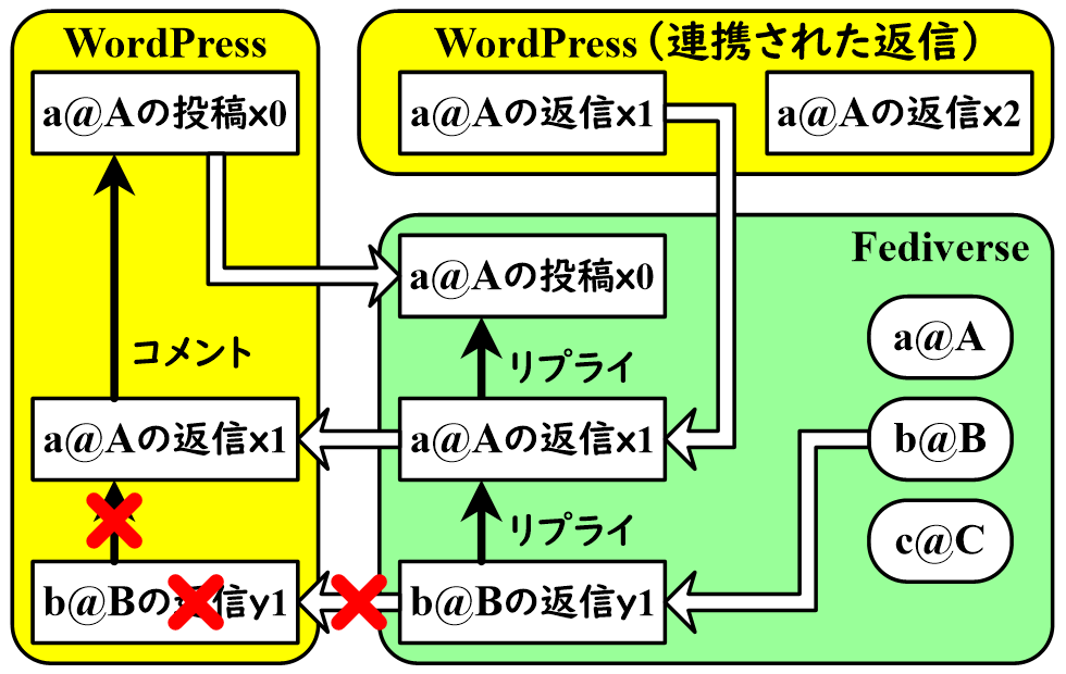 この余所者のように感じるのは、 #WordPress のコメント欄に届いたコメントは #Fediverse から届いたリプライだからではないかと思った。それで、上のようなイメージになり、「連携された返信」に対しては #Fediverse の他のアカウントからのリプライもコメント欄に表示されないのではないかと推測した。