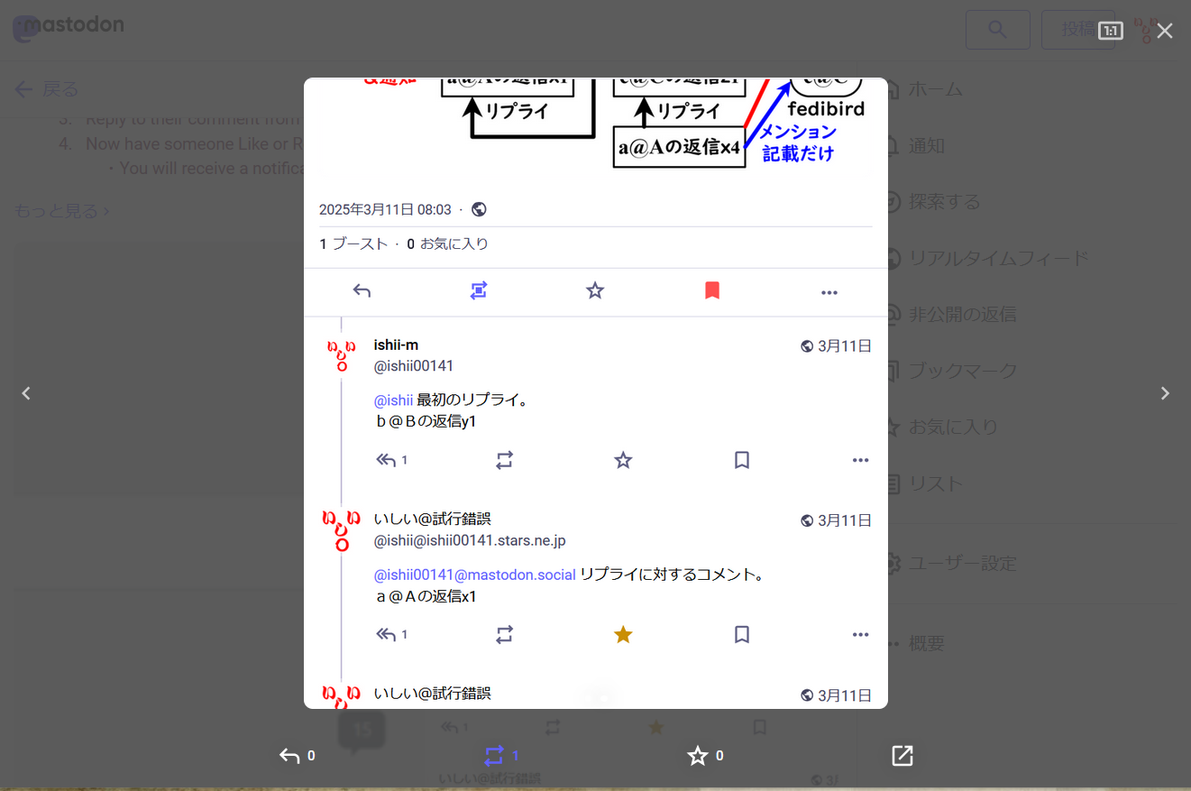 下にブーストボタンが見える。これの意味が分からずにクリックしてブーストを解除してしまったことがある。左右には矢印が見えない。このほかの投稿でも同じように左右の矢印が見えないことがある。画像をクリックした場合の背景色がなぜか白くなってしまう。