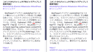 未分類 WordPress投稿を修正してもマストドンが無視することもある プラグインActivityPubを使うとWordPressの投稿をMastodonなどのFediverseで表示することが可能になるが、WordPressの本文を修正するたびにマストドンに通知されることを心配している声を見た。結論を先に書く... 2026.01.14 0 未分類