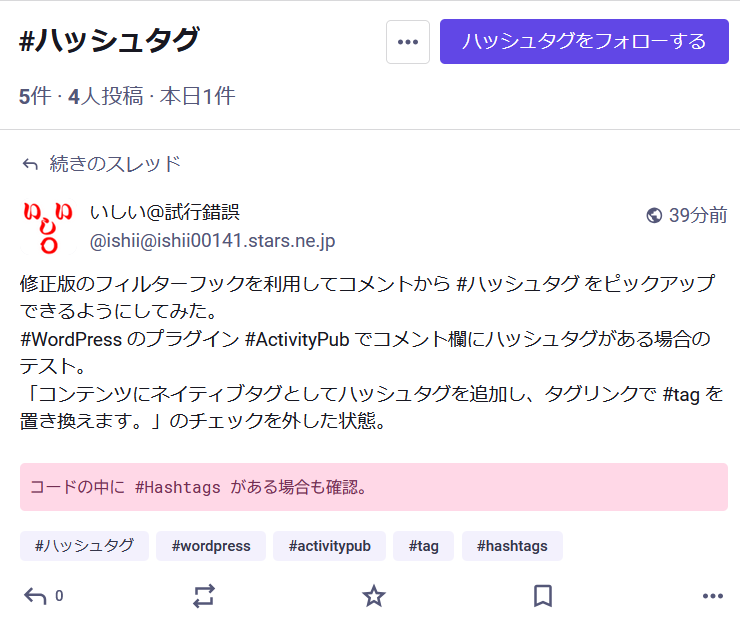 コメントではなく本文の方は #WordPress のプラグイン #ActivityPub の設定の「Hashtags」の「コンテンツにネイティブタグとしてハッシュタグを追加し、タグリンクで #tag を置き換えます。」のチェックを外した状態にしてある。それは、次の所で確認したバグを避けるため。